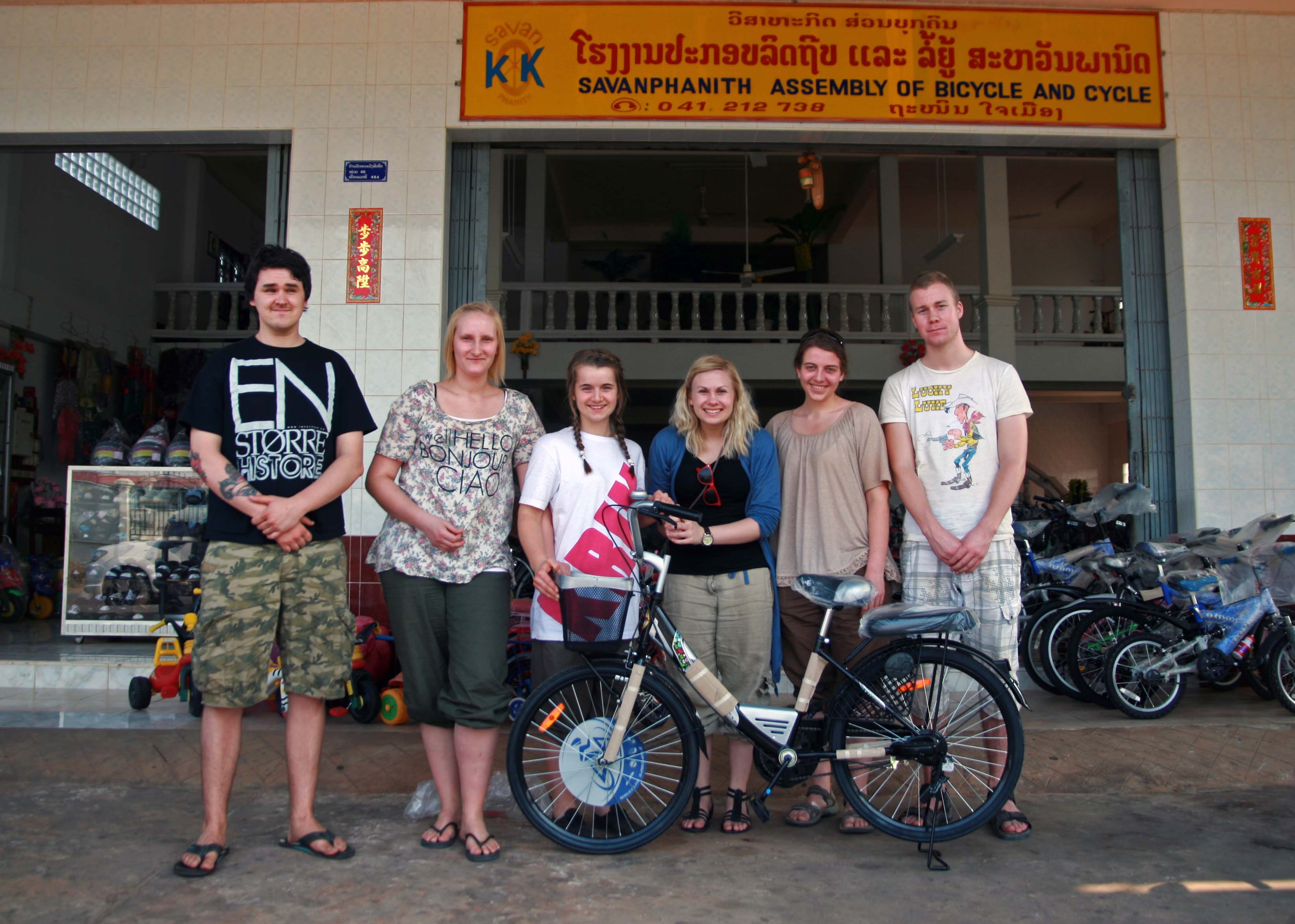 Besøket hos Kemani og familien hans gjorde sterkt inntrykk på studentene fra Norge. Det ar lett å se at Kemani gikk langt hver dag, for skoene hans var helt tynnslitte med store hull rundt hælen. Studentene ønsket derfor å gi en sykkel til Kemani. Det synes vi i Skoleprosjektet var en god idé, så vi kjørte rundt i Savannakhet på jakt etter en sykkelbutikk (butikken der vi kjøpte sykkel til Gai var stengt). Som i alle byer har sjåfører god greie på hvor man finner forretninger, så vi stoppet en tuk-tuk i et kryss og spurte om veien til en sykkelbutikk. Vi fikk ingen gode tips, og ikke nok med det, 10 meter ned i gaten ble vi stoppet av politiet som ville gi oss bot for å ha stoppet i et kryss. Vi ble tatt med bort til en «trafikkpoliti-hytte» der vi ble strengt forklart trafikkregler og beskjed om at dette ble en bot. Vi forsøkte å forklare situasjonen, at vi jobber i et skoleprosjekt der vi hjelper fattige barn. Etterhvert glemte politibetjenten boten, og da vi spurte om han visste om en sykkelbutikk, tok han like gjerne på seg hjelmen, satte seg på motorsykkelen og viste oss veien til nærmeste sykkelbutikk.