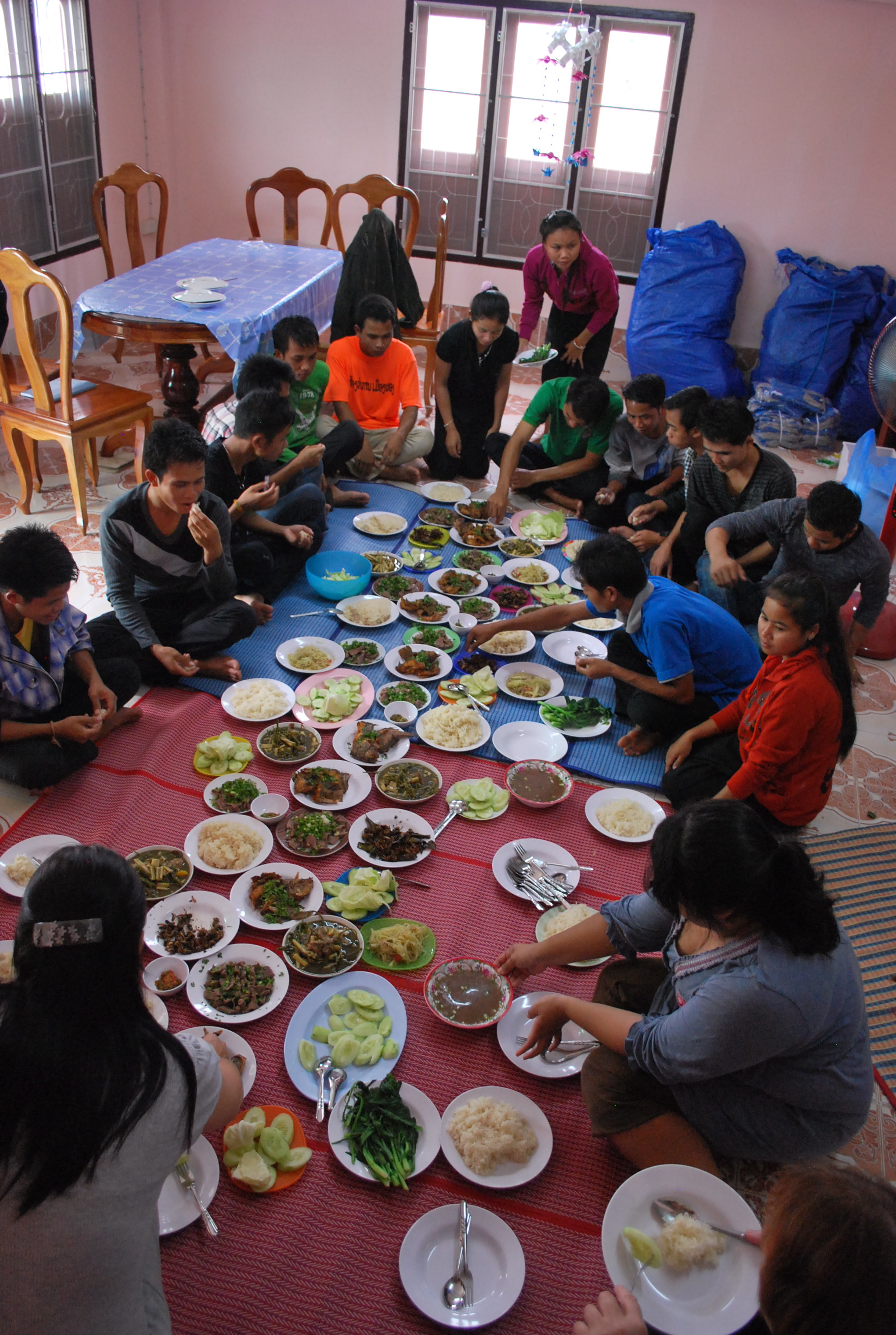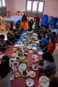 Den 1.oktober har vi hatt besøk av lærerskolestudenter, 16 i tallet. Vi hentet 7 av dem tidlig på morgenen og reiste til markedet og handlet ingredienser til en felles lunsj. De syv fikk handle det de selv ønsket at vi alle 25 skulle spise, alt fra kjøtt og fisk til massevis av ulike grønnsaker og ikke minst gresshopper. Senere på formiddagen hentet vi de andre 9 og vi hadde felles lunsj på laotisk vis på gulvet.